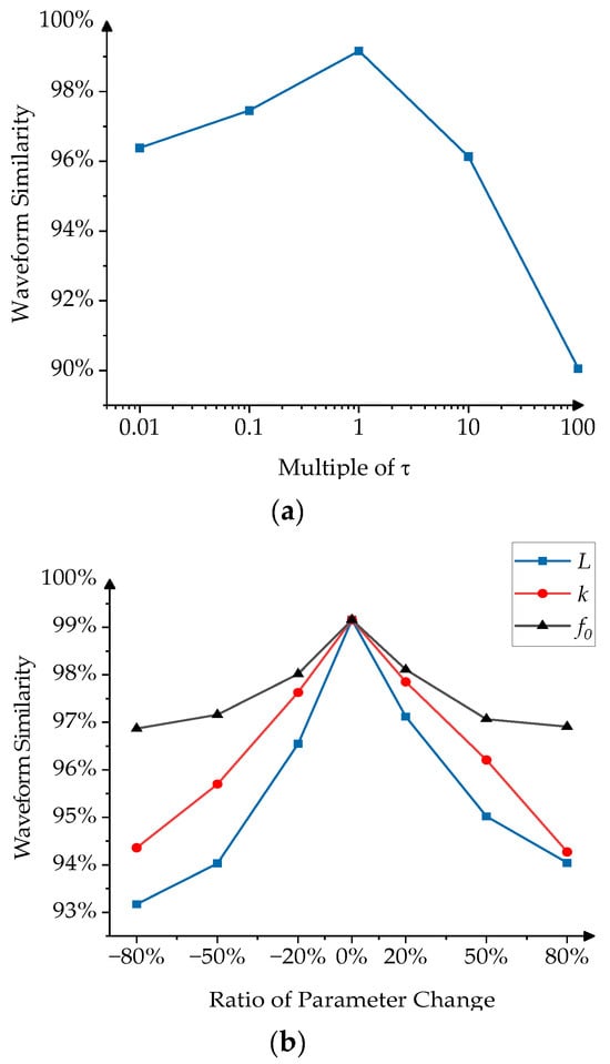 Figure 14a indicates that increasing from the ideal matching value to 100 times significantly affects the resemblance between the arc current waveform produced by the model simulation and the measured arc current waveform. Nonetheless, when is diminished to 0.01 times, the effect on waveform similarity is quite minimal. As examined in Section 3.3, when the value of is really large, the arc voltage varies gradually, resulting in considerable distortion at the zero-crossing time. When is minimal, the rate of change in arc voltage is rapid, and the zero-crossing time of arc current closely aligns with the optimal match; however, jitter occurs at the zero-crossing point of the current. Nonetheless, this exerts a negligible influence on the current waveform during the entire cycle.