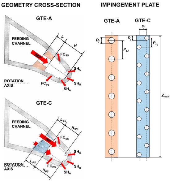 In internal cooling, factors such as the shape and arrangement of jet holes, jet distance, Reynolds number, and jet recirculation significantly influence the cooling effectiveness of the leading edge. The effects of different jet hole shapes (circular, slot, and triangular) and varying sizes of small triangular roughness on heat transfer in jet arrays have been studied [1]. Slot-shaped jet holes typically provide a heat transfer enhancement comparable to that of circular jet holes, while triangular jet holes exhibit lower heat transfer enhancement. Adding small triangular roughness can improve the heat transfer for both circular and slot-shaped jet holes, but has little effect on triangular jet holes. Khalil et al. [2] indicated that increasing the diameter of the jet holes in the flow direction demonstrates optimal heat transfer performance, while reducing the diameter in the flow direction results in the poorest heat transfer uniformity. Andreini et al. [3] investigated two different geometries of jet cooling holes, as shown in Figure 1, comparing their heat transfer characteristics under static and rotating conditions. In the figure, the two structures represent jet holes located at the center and edge of the blade internal partition. The results show that the rotational effects interact with the supply conditions, altering the lateral diffusion of the jet and overall heat transfer capability. Different hole arrangements lead to varying heat transfer patterns, and the cooling effectiveness is related to specific flow phenomena within the leading edge cavity and the interactions among different parts of the system.