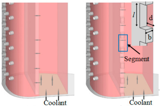 Wu et al. [14] compared two impingement cooling models, one with baffles and one without (as shown in Figure 2, to study the effects of high-temperature conditions, the presence of baffles, and the temperature ratio between the mainstream and the coolant on cooling performance. The results indicated that the use of baffles can prevent the deterioration of heat transfer caused by crossflow and, compared to traditional designs, can improve the cooling effectiveness at the leading edge of the blades by over 30 K temperature difference. Furthermore, under real operating conditions of gas turbines, two new correlations were proposed for the surface-averaged Nusselt number with respect to the jet Reynolds number and temperature ratio. The correlation between the surface-averaged Nusselt number (Nu), the Reynolds number (Rej), and the temperature ratio (TR) for the model with separators can be expressed as Equation (3). For the model without separators, the correlation between the surface-averaged Nu and Rej is shown in Equation (4).