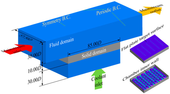 Wang et al. [4] compared two different injection methods: axial and tangential jetting, finding that tangential jetting provides a more uniform heat transfer distribution. At the same time, the local Nusselt number increases with the increase in jet Reynolds number. Salem et al. [5] investigated the effects of linear and staggered nozzle arrangements on cooling performance. They found that as the distance from the jet to the target plate increases, the peak local Nusselt number decreases, and the staggered nozzle arrangement negatively affects cooling performance. Calzada et al. [6] analyzed the cooling effectiveness of two rows of staggered jet holes using transient liquid crystal technology and measured the distribution of heat transfer coefficients under different Reynolds number conditions, providing foundational data for understanding the flow characteristics of this specific configuration. He et al. [7] found that a smaller turning angle of the nozzle leads to counter-rotating vortices and high turbulence intensity along the flow direction. A larger turning inner radius causes the jet flow pattern to transition from impinging jet to a laminar flow adhering to the target surface, thereby affecting heat transfer efficiency. An increase in the jet Reynolds number significantly enhances heat transfer and total pressure loss, and the influence of channel geometric parameters is more pronounced at high Reynolds numbers. Increasing the jet spacing and the distance from the jet to the target surface led to a decrease in pressure drop and heat transfer, with a local minimum observed in their relationship under certain specific conditions. This phenomenon indicates that there exists an optimal combination of jet spacing and distance to the surface, achieving the best heat transfer performance while maintaining a low pressure drop [8]. Based on experimental data, researchers [9] developed a design method that estimates cooling effectiveness through the correlation between the surface Nusselt number and flow coefficient, providing a theoretical basis and practical guidance for the cooling design of low-pressure turbine blades. The dimensionless number Nustag, applicable to the analysis and design of turbine blades, can be expressed by Equation (2):