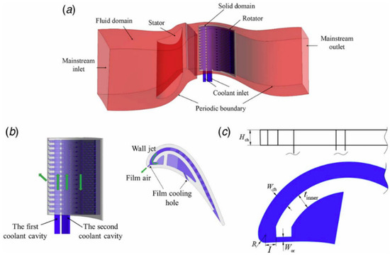 Film/multi-channel wall jet cooling structure: (a) computational domain, (b) sketch of cooling structure in blade, and (c) scheme of bended cooling channel [65].