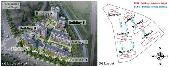 The apartment complex examined in this study is currently under construction in Seoul, South Korea. It comprises six buildings with a total of 828 households. Each building primarily faces south, though they differ slightly in orientation. Figure 2 provides (a) a bird’s-eye view [31] and (b) the layout of each building within the complex, while Table 1 offers detailed information about each building. The design is strategic in ensuring that the front buildings are shorter than the rear buildings to minimize shading on the FPV systems installed on the facades. Additionally, as shown in Figure 2b, the distance between buildings is greater than the height of the front building, further minimizing shading effects.