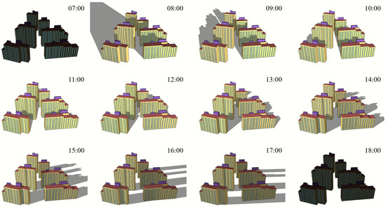 Figure 3 illustrates the hourly shading pattern on the southern facade of the apartment complex as of December 22. Unlike typical apartment complexes in South Korea, the spacing between buildings and their heights was specifically designed to minimize shading on the facades of buildings located behind them. However, except for Buildings C and D, which are positioned at the front, all four other buildings were found to be impacted by shading from the buildings in front. Notably, the lower floors of the shaded buildings were affected by shading for most of the day.