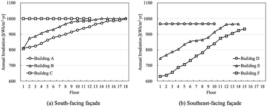 The annual vertical irradiation of the facade for each floor remains constant at 1000.4 kWh/m2·yr. For Buildings B and C, similar levels of annual vertical irradiation are observed on the upper floors as in Building A, with which they have the same orientation. However, below the third floor of Building B and below the eighth floor of Building C, the annual vertical irradiation drops to less than 90% of that observed for Building A. Building D exhibited differences in annual vertical irradiation by floor, even though there are no adjacent buildings in front. This was caused by shading from Building A during sunset. Buildings E and F had larger decreases in annual vertical irradiation compared to other buildings. On the first floor of Building F, which is furthest back, the annual vertical irradiation was 629.96 kWh/m2, about 34.8% lower than that of Building D’s first floor. Although the top floor of Building F had no direct shading, it had a lower annual vertical irradiation than the top floors of other buildings, due to diffused solar radiation being blocked by nearby buildings.