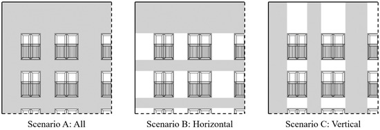 In addition to incorporating color in PV modules, the design of a building can further leverages PV modules as design elements by utilizing pattern formation and color arrangement on the exterior. Based on this concept, three basic design scenarios for the arrangement of PV modules are assumed for this study. In Figure 5, examples of each scenario are illustrated. In Scenario A, PV modules are applied across the entire exterior wall, excluding the windows. In Scenarios B and C, the PV modules are arranged horizontally and vertically in the spaces between windows on the exterior wall. By combining or partially applying these scenarios, various design possibilities can be created for the facades of apartment buildings.