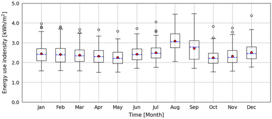 Daily EUI for each month based on electricity consumption of the filtered suitable apartment complexes.
