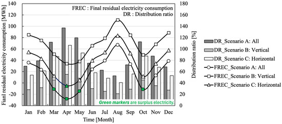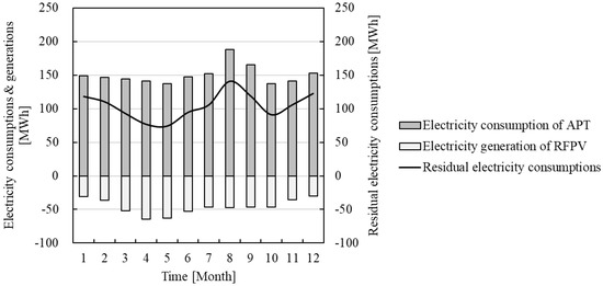 In this section, the electricity consumption of the apartment complex, the electricity production from RFPV systems, and the contribution ratio of RFPV systems in meeting the complex’s electricity needs are evaluated. Figure 8 illustrates the monthly electricity consumption, the electricity produced by RFPV systems, and the residual electricity consumption (REC), which was calculated by subtracting the production from the consumption.