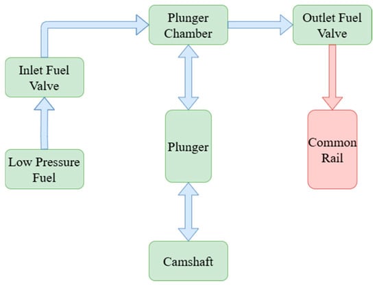 The boundary model of the high-pressure fuel pump is shown in Figure 3. Based on the flow process and states of the fuel within the high-pressure fuel pump, the pump is divided into the following modules: low-pressure fuel supply module, inlet valve module, plunger chamber module, outlet valve module, plunger module, and cam module.