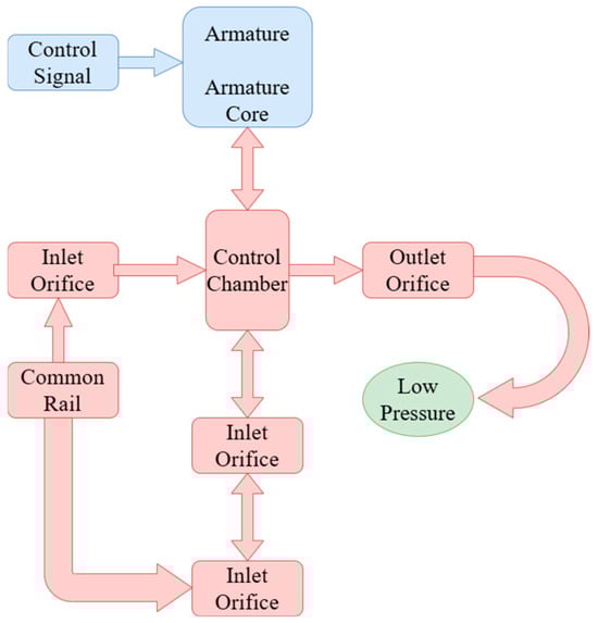 Based on the flow process and states of fuel within the injector, the injector is divided into the following modules: signal input/output module, electromagnetic module, fuel inlet/outlet throttling orifice module, control chamber module, and oil circuit module, as shown in Figure 5. The opening and closing of the solenoid valve are controlled according to the engine operating conditions and firing sequence to achieve fuel injection and the corresponding injection sequence for the injector.