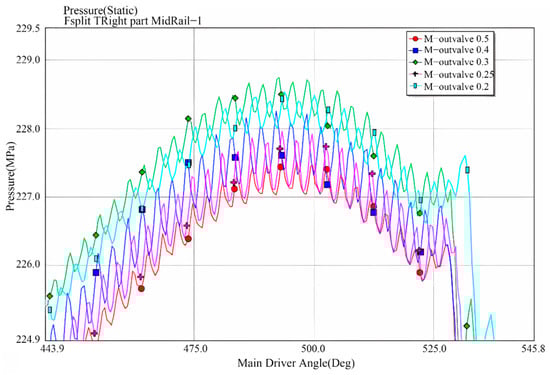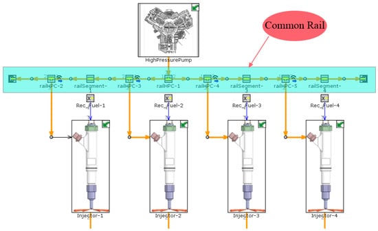First, the Assembly function is used to encapsulate the simulation models of the high-pressure fuel pump, common rail, and injector into submodules. Then, the “SubAssInternalConn” module connects these submodules to form a complete simulation model of the electronically controlled HPCR injection system, as shown in Figure 7. The boundary model of the common rail is essentially a rigid container. In this study, the common rail is simplified into several pipeline volumes based on its actual diameter, volume, and the distribution of its inlet and outlet. A simulation model is established using pipeline modules and connection modules. According to the theory of pressure waves, the pressure states at different positions within the volume of the common rail vary, meaning that pressure magnitude and oscillation frequency are functions of both space and time. However, the overall trend of pressure wave variations remains consistent. Therefore, the midpoint of the common rail is selected as the reference measurement point.