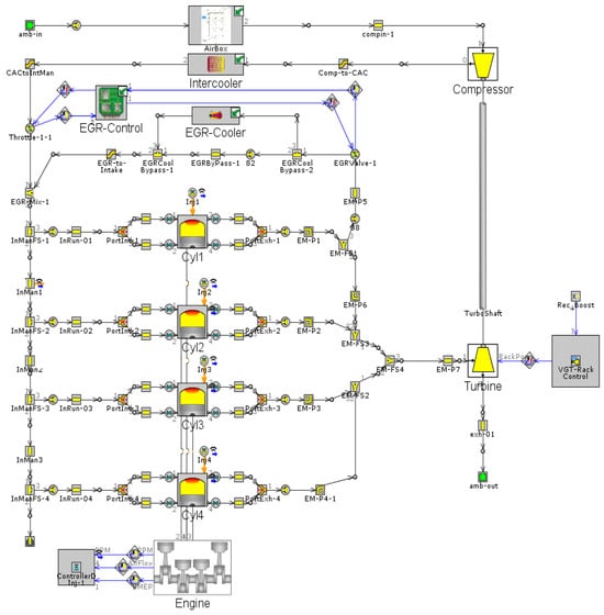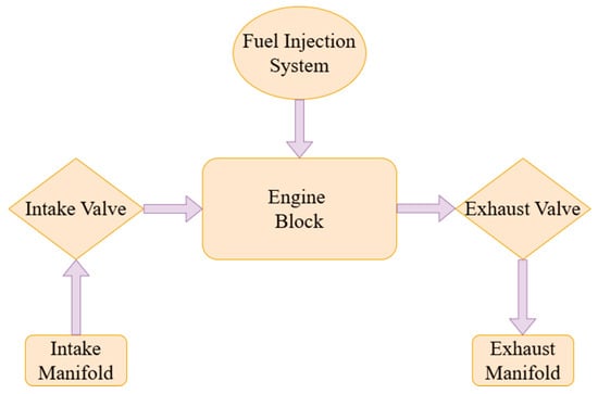 The physical model of the engine is primarily divided into three components: the intake system, the cylinder, and the exhaust system. Following the flow sequence of the working medium within the engine, the actual operating process is simplified and standardized into four operational boundary models: the intake system boundary, the cylinder–piston–crankshaft system boundary, the fuel injection system boundary, and the exhaust system boundary, as illustrated in Figure 8.