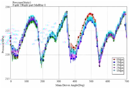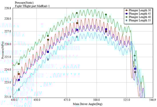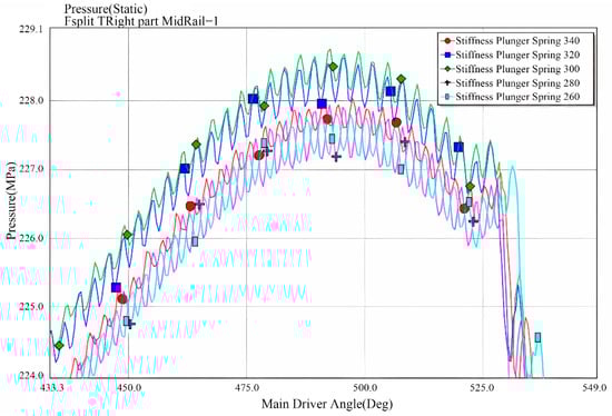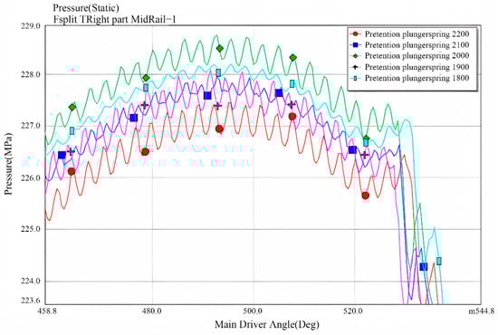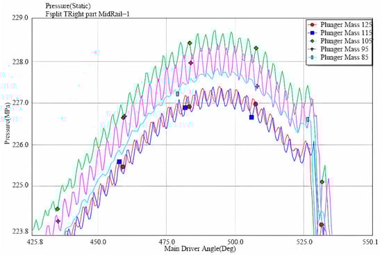 - By analyzing the influence of plunger parameter variations in a high-pressure fuel pump on rail pressure fluctuations, it was found that changes in the plunger’s mass and length affect rail pressure oscillations. An increase in plunger mass results in a reduction in the rail pressure. When the plunger length increases, both the frequency and amplitude of rail pressure fluctuations rise slightly, with a maximum amplitude increase of approximately 1 MPa. Simultaneously, the increased plunger length elevates the fluctuation frequency and amplitude of rail pressure, though the amplitude increase is limited to around 0.1 MPa. Additionally, an increase in the preload of the plunger spring leads to a decreasing trend in rail pressure, with the reduction varying between 0.5 MPa and 2 MPa, while the amplitude of pressure fluctuations also decreases. Conversely, variations in the plunger spring stiffness exhibit a relatively minor effect on rail pressure fluctuations.