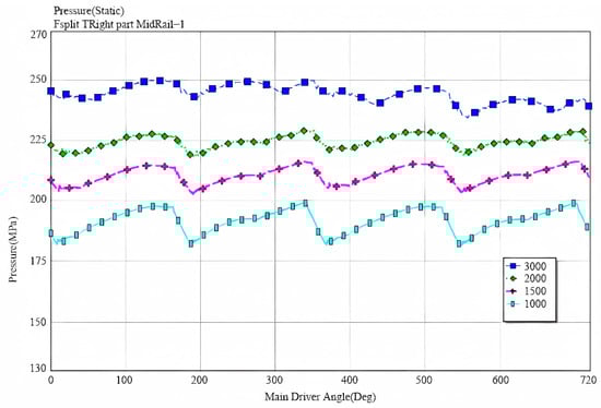 - Through the analysis of the impact of fuel supply parameters in the high-pressure common rail fuel injection system on the rail pressure fluctuation, it was found that the fuel supply pressure, camshaft speed, and injection pulse width all have significant effects on rail pressure fluctuations. At different fuel supply pressures, the pressure fluctuation frequency during the fuel supply phase is higher than that during the injection phase. As the camshaft speed increases, the common rail pressure increases proportionally, with the fluctuation frequency rising and the amplitude decreasing. Specifically, the ratio of the common rail pressure at a camshaft speed of 3000 rpm to that at 2000 rpm is approximately 1.11. Increasing the injection pulse width results in a reduction in the pressure fluctuation amplitude within the common rail. When the injection pulse width is 32 CA, the amplitude of pressure fluctuation decreases by approximately 3 MPa compared to when the pulse width is 26 CA.