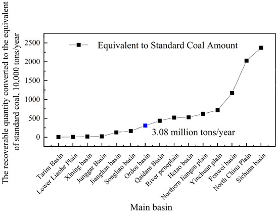 Geothermal fluid recoverable heat reserves of main basins in China. The blue square is the equivalent to standard coal amount of the Ordos Basin.
