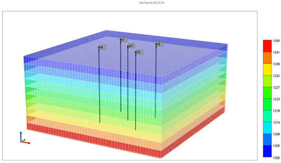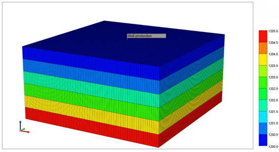 The northern Shaanxi oil region is a “three low” reservoir. Based on the basic data of the Chang 2 reservoir in a target block, the situation of water production and heat extraction is simulated. The reservoir’s physical parameters are shown in Table 1, and the formation heat recovery model is established on this basis. When constructing the three-dimensional geological model for direct water extraction in the study area, a region with both horizontal and vertical dimensions of 800 m was established, and the depth of the vertical range of the model was 1200~1206 m. A homogeneous model was utilized, meaning that the calculation area of the model in the study area was composed of a cube of 800 m × 800 m × 6 m. The model grid was divided using an isometric method. The initial formation conditions of the reservoir model for Block Chang 2 can be found in Table 1. Additionally, the model boundaries were defined as thermally insulated and impermeable.