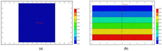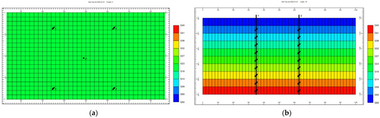 In the analysis of well pattern distribution of the Chang 2 reservoir conducted by Liu Xue et al. [8], the well pattern distribution of the Chang 2 reservoir in the target area has a more flexible diamond-shaped inverted nine-point well pattern. Therefore, the existing abandoned well pattern is suitable for a variety of injection–production methods. However, it can be seen from the research status that the heat exchange of two-injection–one-production is greater than that of one-injection–one-production, and the heat exchange area of the one-injection–four-production well pattern is the largest. Therefore, two well pattern structures, four-injection–one-production and one-injection–four-production, were selected. Combined with different injection pressures, the heat recovery of the Chang 2 bottom water reservoir in western Shaanxi was analyzed. For the establishment of the thermal model for injection in the study area, a homogeneous model was also adopted. Drawing on the previous literature, a reservoir thickness of 50 m was selected, and the cubic model grid was divided into dimensions of 1000 m × 1000 m × 50 m using an isometric method. The initial formation conditions and boundary settings of the Chang 2 reservoir model in this study block are consistent with those of the direct water extraction model, the injection–production well spacing is set at 200 m, and layers 2 through 9 are shot.