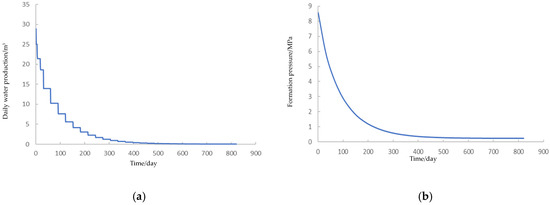 Changes in daily water production and formation pressure during perforation water heating. (a) Perforated water daily water production. (b) Perforated water formation pressure change.