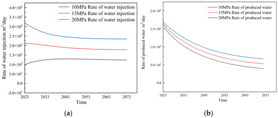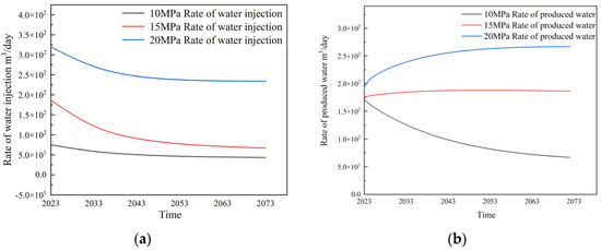 It can be seen from Figure 11 that the daily water injection rate at 20 MPa and 15 MPa decreases, but at 15 MPa, it decreases slowly. This is because after a period of injection, the formation pressure around the injection well gradually increases [11], the pressure around the production well becomes smaller, the production pressure difference becomes smaller, and the injection rate becomes slower. In addition, it can be seen in (b) that the greater the pressure, the greater the daily water extraction rate.