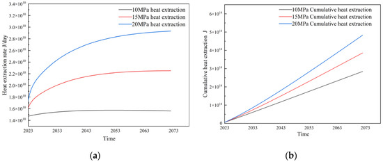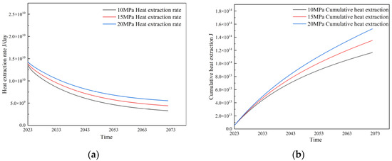 It can be seen from Figure 8 that the daily heat recovery rate increases at first and then levels out, which is related to the water recovery rate. The cumulative heat recovery is related to the heat recovery rate and the number of years [10]. The larger the heat recovery rate is, the longer the heat recovery period is, and the greater the cumulative heat recovery is.