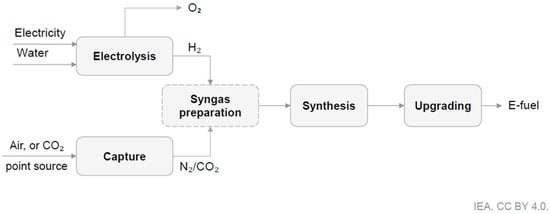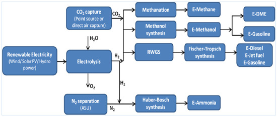 A more detailed diagram of e-fuel production (according to [23]) is shown in Figure 2. Main methods for converting hydrogen to e-fuels are presented there.