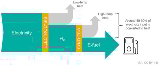 Large-scale commercial electrolyzers currently operate with efficiencies in the order of 65–70% in terms of calorific value (LHV), while the efficiency of the later stage of e-fuel synthesis ranges from 65 to 85% (LHV) [24], depending on the final product [22]. As a result, the overall thermal efficiency of the e-fuel production process ranges from 40 to 60% [22].