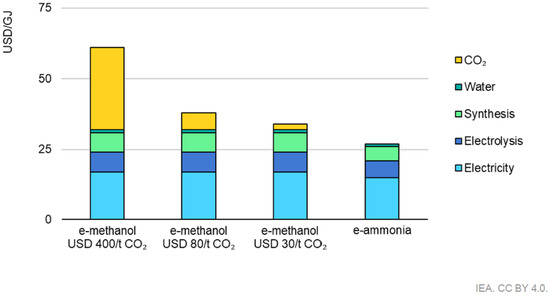 The averaged cost of e-ammonia and e-methanol at different CO2 capture costs, according to [22], is shown in Figure 6.