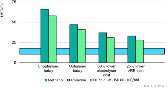 The averaged cost of e-ammonia and e-methanol according to potential cost reduction measures, according to [22], is shown in Figure 8.