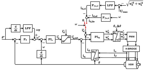 where the LPF has a form of the type , is the cutoff pulsation, and s is the Laplace operator. The classical FOC on the speed loop enforced with field-weakening control is designed as