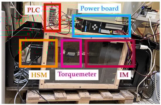 Test bench with HSM (Stepper 1, orange box), power board (cyan box), PLC (red box), torquemeter (magenta box) and induction machine as brake (IM, purple box).