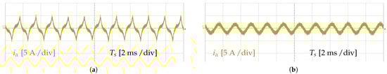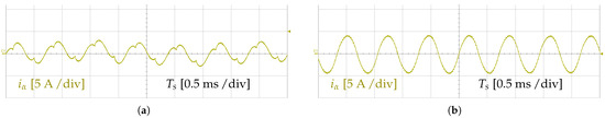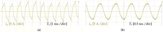 Stepper 1: Steady-state output current with microstepping control and FOC at = 122 with of 140 . (a) Microstepping control with a load torque of 4.5 . (b) FOC with FW with a load torque of 4.5 .