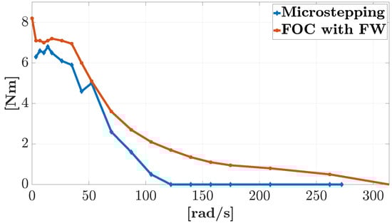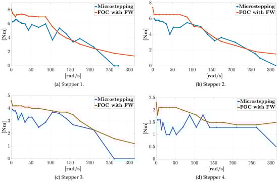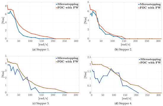 In Figure 10, the torque/speed curve is reported for every stepper motor considering of 140 for microstepping control and FOC with FW. It can be seen that using FOC with FW, the torque remains constant until the nominal speed is reached, and then the torque profile decreases, while with microstepping the torque profile has different dips caused by the mechanical resonance, as discussed in Section 3. As already put in evidence by the previous subsection, the speed range is extended with FOC with FW.