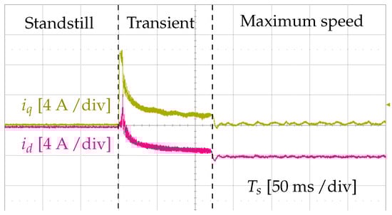 From the torque/speed characteristic displayed in Figure 7, it can be seen that FOC with FW is able to reach higher speeds, extending the speed range of the machine with respect to classical microstepping. Furthermore, the measured torque of FOC with FW is higher in every working condition. Figure 8 summarizes the waveform of the dq currents with a speed step starting from a standstill and reaching the maximum speed of 314 at no load with of 70 . The minimum current is limited to −4 . At the beginning of the transient, the positive values of are due to the absence of the decoupling between d and q axis.