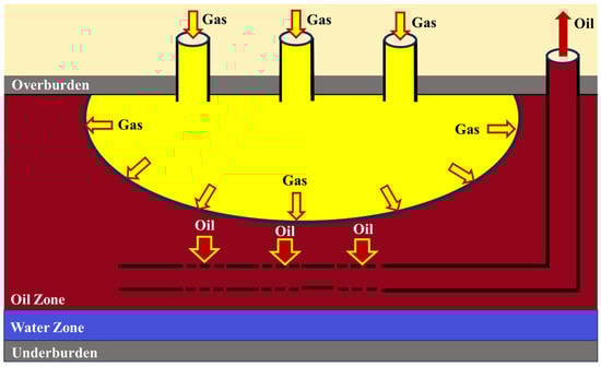 OAGD combines the principles of oxygen-reduced air injection with gas-assisted gravity drainage (GAGD). Compared to traditional water flooding techniques, GAGD leverages the density difference between gas and crude oil to effectively mobilize residual oil under the influence of gravity. This method is particularly suitable for high-angle, thick, or complex heterogeneous reservoirs where conventional technologies struggle to achieve sufficient coverage and recovery [9,10,11]. The core advantage of this technology lies in its ability to fully utilize gravity segregation effects. The injected gas diffuses upward within the reservoir, causing crude oil to flow downward under gravitational forces toward the production well, thereby significantly enhancing the vertical displacement efficiency (Figure 2). This displacement method prevents water breakthrough and channeling issues commonly encountered in water flooding processes, effectively expanding the swept volume and mobilizing a greater proportion of residual oil [12].