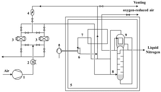 Cryogenic separation process flow. 1—air compressor, 2—pre-cooling unit, 3—molecular sieve adsorber, 4—electric heater, 5—cold box, 6—turbo expander, 7—main heat exchanger, 8—rectification column, and 9—condenser evaporator.