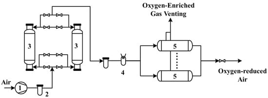 The core of membrane separation technology lies in the selection of membrane materials. For specific membrane materials, nitrogen and oxygen in the air exhibit significant differences in solubility and diffusion rates, particularly under higher pressure conditions. By utilizing the pressure differential across the membrane, faster-diffusing gases such as water vapor and oxygen preferentially pass through to the low-pressure side, forming oxygen-enriched gas, while slower-diffusing nitrogen accumulates on the high-pressure side, thereby achieving the separation of oxygen-reduced air [23]. The process flow of the membrane separation method is shown in Figure 4.