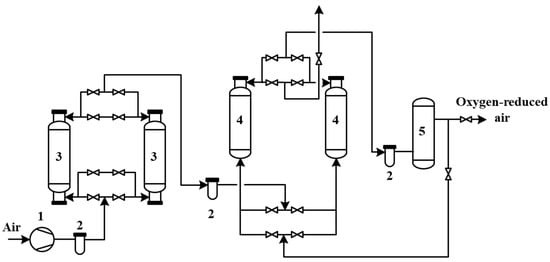 Pressure swing adsorption process flow. 1—air compressor, 2—filter, 3—dryer, 4—PSA tower, and 5—buffer tank.