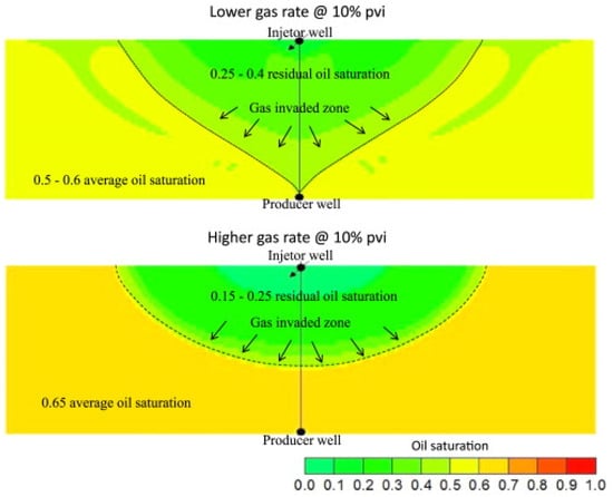 Comparison of the gas injection rate on oil saturation before the breakthrough time [60].