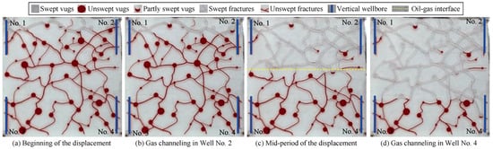 Proper control of the gas injection rate is crucial for maintaining the stability of the oil–gas interface. Lower injection rates can help establish a stable oil–gas interface, slow the downward movement of the interface, and prevent the occurrence of viscous fingering [57,58]. However, excessively high injection rates can compromise interface stability, accelerating the movement of the gas front and causing gas channeling, which reduces the oil recovery efficiency. This issue is particularly pronounced under miscible displacement conditions (Figure 8) [10,59,60].