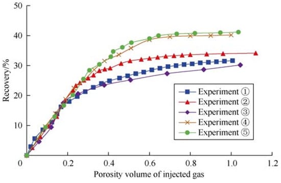 Determining the optimal range of injection rates is equally important, as oil recovery typically exhibits a trend of initially increasing and then decreasing with the injection rate [61]. Studies have shown that appropriately reducing the injection rate can decrease residual oil saturation, increase the gas swept volume, and enhance oil recovery [62]. However, excessively low injection rates may lead to insufficient viscous force and capillary trapping, prolonging the breakthrough time and impacting economic efficiency. Conversely, excessively high injection rates can exacerbate gas breakthrough, resulting in a decline in oil recovery (Figure 9) [10].