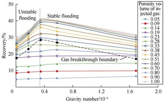 Relationship between gravity number and oil recovery factor in oxygen-reduced air gravity drainage [68].