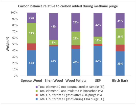 A summary of the individual experiments performed at a reactor temperature of 1100 °C and with a purge gas input of 90/10 of CH4/N2 is shown in Table 2. The holding time with the CH4 purge was 90 min, except for experiment 7 with spruce wood, which stopped at the 75 min mark due to unexpected complications. The start weight for the biocarbon catalyst was about 80 g, except that of the SEP biocarbon, which was about 100 g. During the experiments, the biocarbon catalyst was heated to the target temperature in an inert atmosphere. The gases that were released during that period were measured with a GC and were mainly composed of H2, CO and CO2. These volatiles could have been released because of CO2 adsorption from ambient air or because of volatiles that were still left in the biocarbon due to the difference in the temperature at which these biocarbons were produced (1000 °C). These volatiles are depicted in row 2 in Table 2, in total grams, and in weight percent relative to the initial weight, depicted in row 1. This amount was then subtracted from the initial biocarbon weight and is presented in row 3. The weight loss prior to treatment varied by around 1% relative to the initial weight, except for the experiment with spruce wood, where this initial weight loss was minimal. When the holding time reached 90 min, the methane was stopped and replaced with nitrogen. The electrical heating was stopped, and the treated biocarbons were left to cool before they were taken out of the basket, sieved with a mesh size of 2 mm and weighed. The weights gained, in grams, and relative to the start biocarbon mass are shown in row 4. It is important to mention that the experiments with birch wood encountered some challenges with air leakage, which resulted in a CO concentration of 1.2 mol% at the outlet of the reactor, which was stable during the entire methane purge period. The oxygen leakage resulted in both a partial oxidation of the methane and of the deposited carbon, which could explain the lower deposition rate in comparison to the experiment with spruce wood. Although there were some compositional and physical differences between the two wood species, these differences alone cannot explain the large difference in the amount of carbon deposition, which must mainly have been a result of the air leakage. The results for birch wood were for this reason not included in Table 2 or in the carbon balance (Figure 3). The weight gain was about 42% for spruce wood and birch bark, 33% for wood pellets, and 13–14% for birch wood and steam-explosion pellets.
