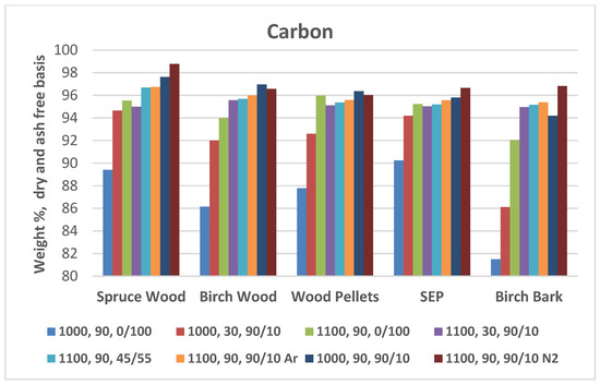 Weight % of carbon normalized on dry and ash-free bases. The first series (1000, 90, 0/100) is that for the untreated biocarbon.