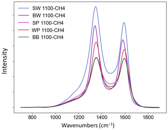 Figure 5 shows the Raman spectra of the five biocarbon samples after methane cracking. For the current study, the main purpose of the Raman analysis was to characterize the structural differences in the biocarbon after methane cracking. The D3 and D4 bands were included to identify the formation and presence of amorphous carbon structures related to the formation and deposition of carbonous products from methane cracking on the surface of the biocarbon. The data for the untreated biocarbons have been published elsewhere [30]. These spectra have a common feature, with the detection of two specific bands that are common to carbon materials. The Raman spectra for the studied samples generally overlapped across the wavenumber ranges. All five spectra were further processed with deconvolution to show the hidden peak of each sub-band. Figure 6 shows an exemplary Raman spectrum for the spruce wood biocarbon, treated at 1100 °C with CH4/N2 of 90/10 (SW: 1100-CH4-90), and its deconvolution by curve fitting. The first-order Raman spectrum of this sample was characterized by three main strong peaks: the D (or D1, defect or disorder) band around ~1350 cm−1, the G (graphite) band around ~1590 cm−1 and the D3 (or A) band around ~1540 cm−1. The D band is normally related to the presence of carbon with a disordered structure or is induced by disorders in the graphitic lattice, which can be explained by double-resonant Raman scattering. The G band corresponds to the graphite band, which is normally attributed to an ideal graphitic lattice vibration mode with E2g symmetry [43,44].