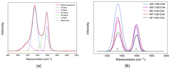 Raman spectroscopy was performed on the biocarbon samples to analyze the molecular structures of the biocarbons. Raman spectra were collected using a WITec Alpha300r instrument from Oxford Instruments. The laser power was set at 6 mW, and spectra were collected from five different regions, with an exposure time of 120 s. The spectrum region 800–2200 cm−1 was used in all analyses. Cosmic-ray spikes were removed using the method developed by Schulze and Tuner. All spectra were smoothed using the Savitzky and Golay filter [34], with subtraction of the baseline to eliminate the fluorescence signal, according to Cao et al. [35]. In this work, the 5-band method was used to deconvolute the Raman spectra, improve the fitting precision of the deconvolution results and obtain more details about the structure of the carbon materials. Five bands were assigned to the relevant Raman bands, including the D band at 1350 cm−1, the G band at 1590 cm−1, the V band at a valley around 1450 cm−1, the D3 band at 1540 cm−1 and the D4 band at 1185 cm−1. The D3 and D4 bands were included to identify possible amorphous carbon structures related to the formation and deposition of the products from methane cracking on the surface of the biocarbon. The 5-band method has been used and reported in other studies [36,37,38,39].