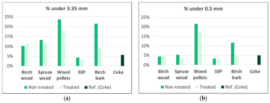 Abrasion strength tests were performed by tumbling the samples for 30 min with a rotation speed of 40 rpm. Figure 7 shows the measured fine fractions that were weighed after sieving both the raw and treated samples. Figure 7a shows the weight fractions for particles below 3.35 mm, and Figure 7b shows those for particles below 0.5 mm. A coke sample, which was used as a reference in the CO2-reactivity tests, was also used here as a reference in the mechanical property analysis. Steam-explosion pellets produced the lowest number of fines for both fractions, which was lower than that for the coke sample. Wood pellets, surprisingly, produced the largest number of fines among all materials. The woodchip species behaved in a similar manner, with fines below 3.35 mm in the range of 10–14% and fines below 0.5 mm close to 5%. Birch bark produced high amounts of fines, with 21% for particles below 3.35 mm (non-treated), which was second to wood pellets. The birch bark was also second to wood pellets for the fraction below 0.5 mm, with 12% for the non-treated sample. However, the birch bark seemed to benefit the most from the methane cracking treatment and showed numbers close to the coke sample in the tumbling tests. In general, the treated samples had smaller fine fractions in comparison to their respective non-treated biocarbons, indicating a positive impact of the CDM on the mechanical properties. Carbon deposition in the treated material seemed to influence the birch bark the most, where the fine fraction dropped from 20 to 10% and from 12 to 5% for the respective fractions of <3.35 and <0.5 mm. Also, wood pellets seemed to show a clear improvement with treatment, while the rest of the samples showed minor improvement.