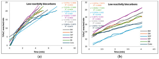 CO2 reactivity measures the reaction rate of fixed carbon in a sample in a CO/CO2 atmosphere. Therefore, it is necessary to know the fixed C (Fixed C) content in the biocarbon sample at the starting point. The proximate compositions for the treated and non-treated samples are presented in Table 3. The Fixed C content in both the non-treated and treated samples was above 90%. After treatment, the Fixed C content increased by around 3%. Table 8 displays the CO2-reactivity characteristics of all the samples. To determine the reaction rates for the different materials, the weight loss rate of the fixed carbon was plotted over time. The reaction rates were then obtained through linear interpolation of the various curves. Figure 8 shows the weight loss rates of the fixed carbon for the treated (low-reactivity) samples along with their respective linear interpolations and the deducted reaction rates. Figure 8a depicts the weight loss rates and the reaction rates over the entire period, while Figure 8b shows the values between 2 and 4 min. Although the overall reaction rate was far from linear, it was possible to obtain reaction rates for shorter time intervals where the data fitted a linear model more closely, as shown in Figure 8b. This approach aimed to compare the different materials to determine the effect of CDM on the reactivity of the treated material, as well as in comparison to the reference material, marked as coke in Figure 8. Similar figures were also produced for the non-treated biocarbons and for different time periods, but only the deducted reaction rates are shown in Table 8. A possible explanation for the non-linearity could be that, initially, when gas is introduced into the system, a high reaction rate occurs within the first few seconds due to the immediate exposure of the sample to the gas. The gas then reacts rapidly with the sample, primarily because of its large surface area and high porosity. As the reaction progresses, the rate gradually slows down, which is attributed to the gas–solid reactions occurring in the denser regions of the sample.