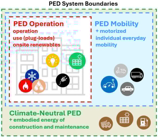 - Climate-neutral PED (outermost layer): incorporates embodied energy related to district construction, maintenance, repair, and mobility.