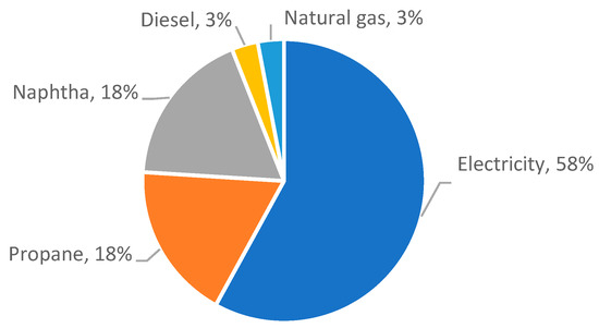 The most used refrigerant fluids were R22 (45%), R404a (26%), and R134a (20.5%). R22 (chlorodifluoromethane) is a hydrochlorofluorocarbon with significant global warming and ozone depletion potential. While Regulation No. 1005/2009 permits the continued use of equipment containing R22, it prohibits repairs that require refilling the system with this refrigerant [45]. In practice, this restriction often renders repairs either infeasible or prohibitively expensive. Throughout the year 2008, the 31 industrial plants under consideration consumed a total of 3462 tons of oil equivalent (toe). Of this total energy consumption, 58% was derived from the electrical power grid, while the remaining 42% was obtained through fuel combustion, as shown in Figure 2. Naphtha and propane were the most frequently used fuels. The heat generated from fuel combustion served several purposes, including heating water for thermisation processes, heating milk, heating whey for cheese curd production, and cleaning equipment and facilities. The total energy consumed resulted in the emission of 7858 tons of carbon dioxide.