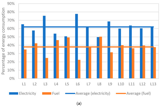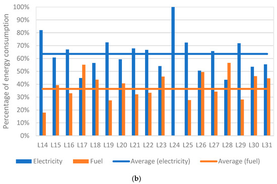 Each of the L values in Figure 3, Figure 4, Figure 5, Figure 6, Figure 7, Figure 8 and Figure 9 represents different Portuguese production facilities. Figure 3 indicated that electricity served as the primary energy source in nearly all the dairy factories surveyed, and in one facility (L24), it was the sole energy source. On average, the ratio of electricity to fuel consumption was 62% to 38% for Traditional Portuguese Hard Cheese and 63.5% to 36.5% for Traditional Portuguese Hard Cheese. However, in facilities L4, L5, and L8, and L17, L26, and L28, fuel consumption was comparable to or even surpassed electricity consumption. This higher fuel usage is likely attributable to on-site cheese curd production, a process that requires heating whey.