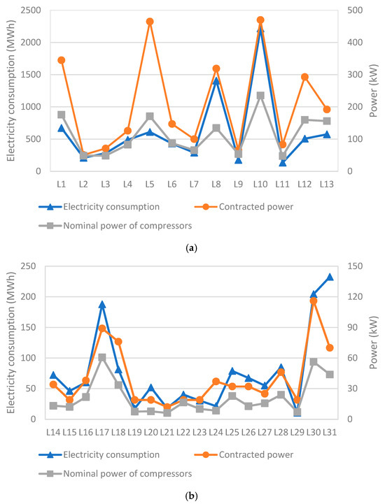 Figure 4 shows the electrical energy consumption, contracted power, and nominal power of the compressors for Traditional Portuguese Industrial Cheese and Traditional Portuguese Farmhouse Cheese, respectively. A strong correlation is observed between these three variables across almost all manufacturing units, highlighting the influence of compressor nominal power on both contracted power and overall electricity consumption. Refrigeration and freezing processes emerged as major energy consumers, accounting for anywhere from 25.5% to over 40% of the total electricity consumed by dairy facilities [22,23].